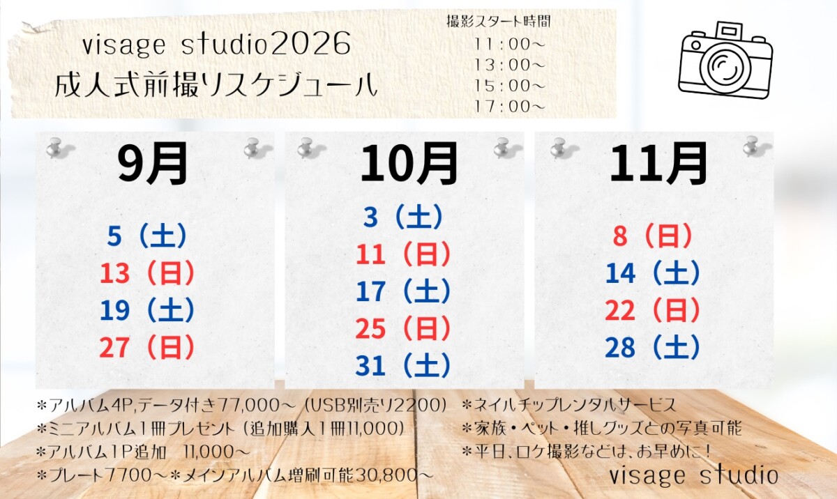 03Apr2026 2026 成人式 秋の撮影スケジュールです 東京 千葉 埼玉 2026のvisage studio 成人式前撮りスケジュールです ロケが希望の方は、いつもの店舗からお問い合わせください 今までvisageの(美容室)ご利用がない場合 お気軽にお問い合わせください Tweet Share +1 Hatena Pocket RSS feedly Pin it visage studioのメンズ成人式 最近のお知らせ一覧お知らせ一覧 visage studioのメンズ成人式 2025.10.03 夜の成人式前撮りコースができました。夜の東京駅の前で!動画も残しましょ 2025.07.11 ホテル日航成田でのファミリー撮影 2025.05.24 visage studioのphoto wedding! 洋装のロケーションプランです 2025.05.02 2025のvisage-studio成人式前撮りスケジュール決定 2025.04.24